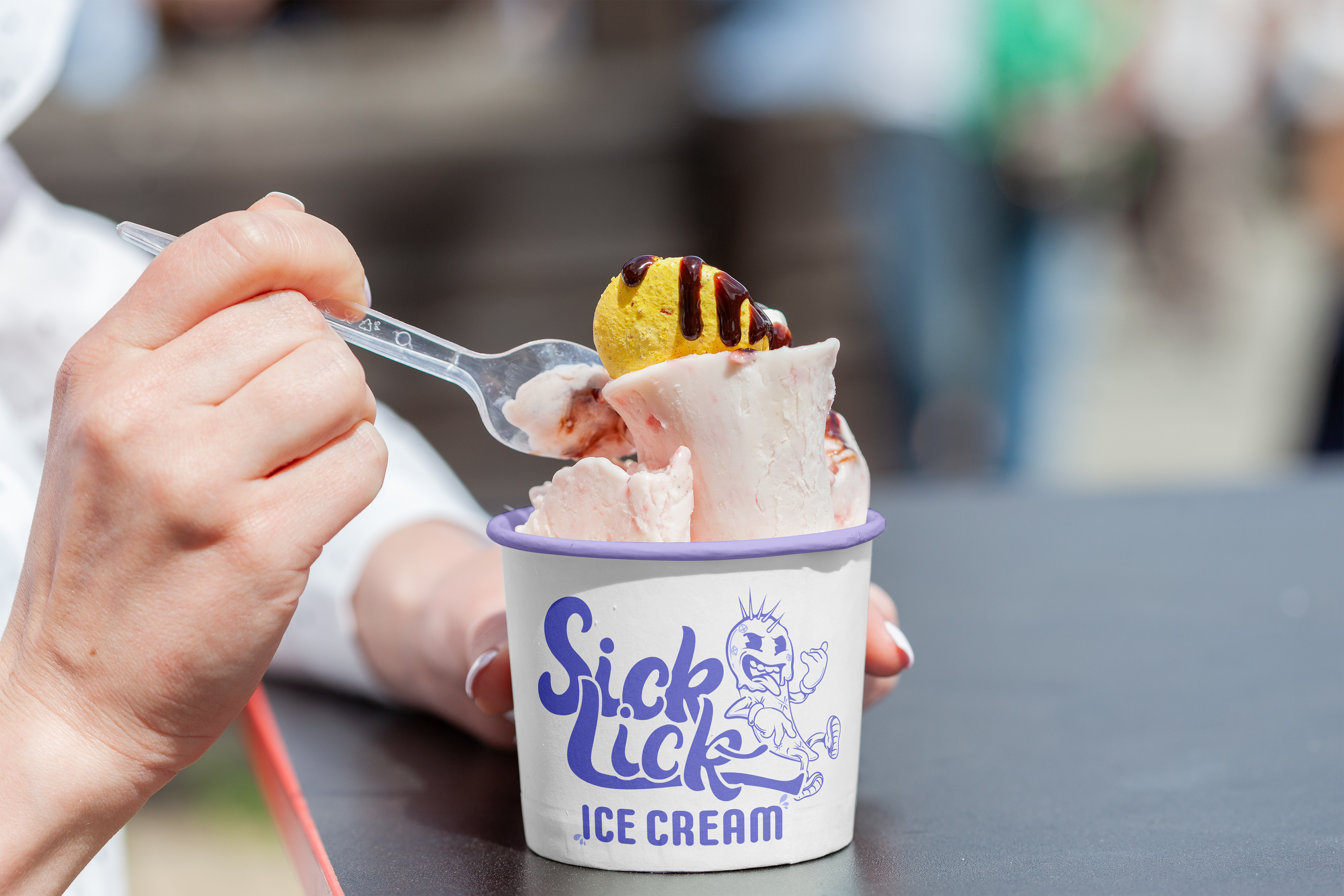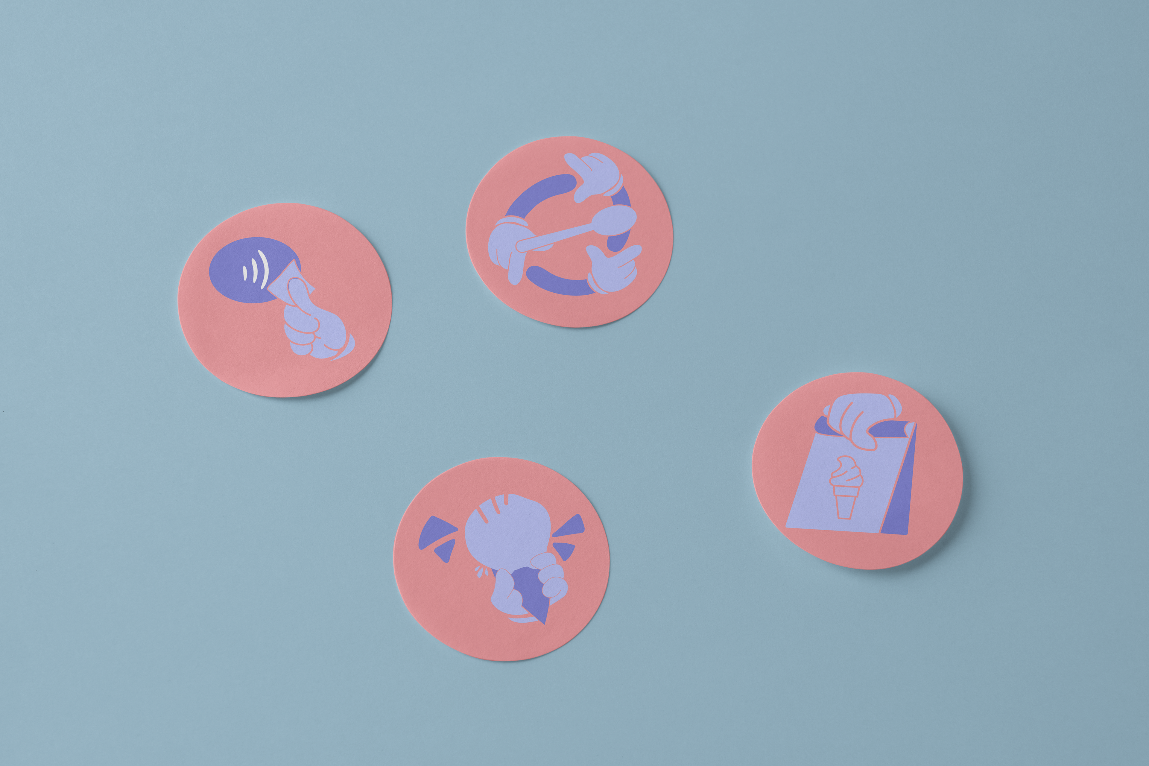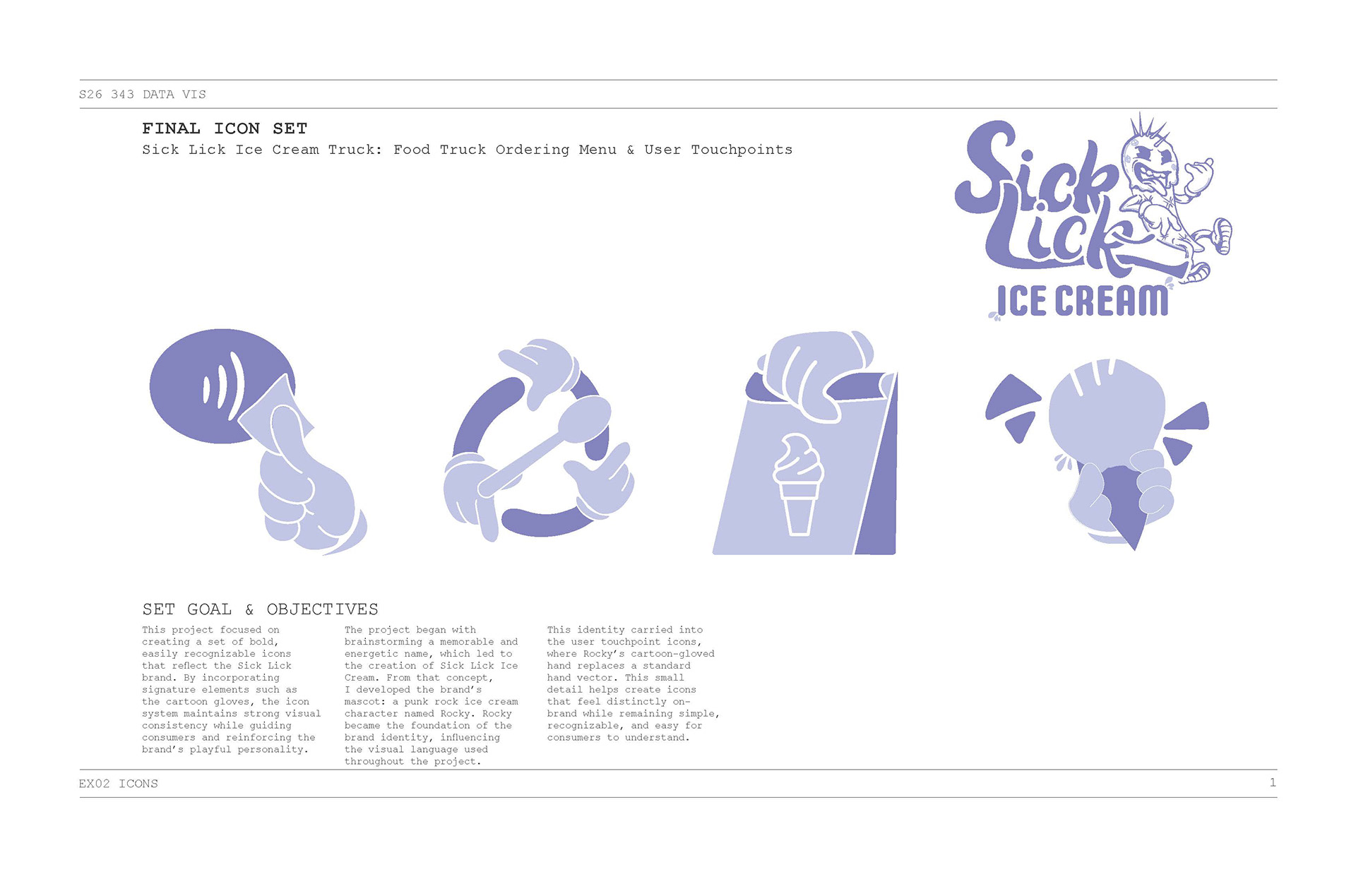 This project focused on creating a set of bold, easily recognizable icons that reflect the Sick Lick brand. By incorporating signature elements such as the cartoon gloves, the icon system maintains strong visual consistency while guiding consumers and reinforcing the brand’s playful personality. The project began with brainstorming a memorable and energetic name, which led to the creation of Sick Lick Ice Cream. From that concept, I developed the brand’s mascot: a punk rock ice cream character named Rocky. Rocky became the foundation of the brand identity, influencing the visual language used throughout the project. This identity carried into the user touchpoint icons, where Rocky’s cartoon-gloved hand replaces a standard hand vector. This small detail helps create icons that feel distinctly onbrand while remaining simple, recognizable, and easy for consumers to understand.