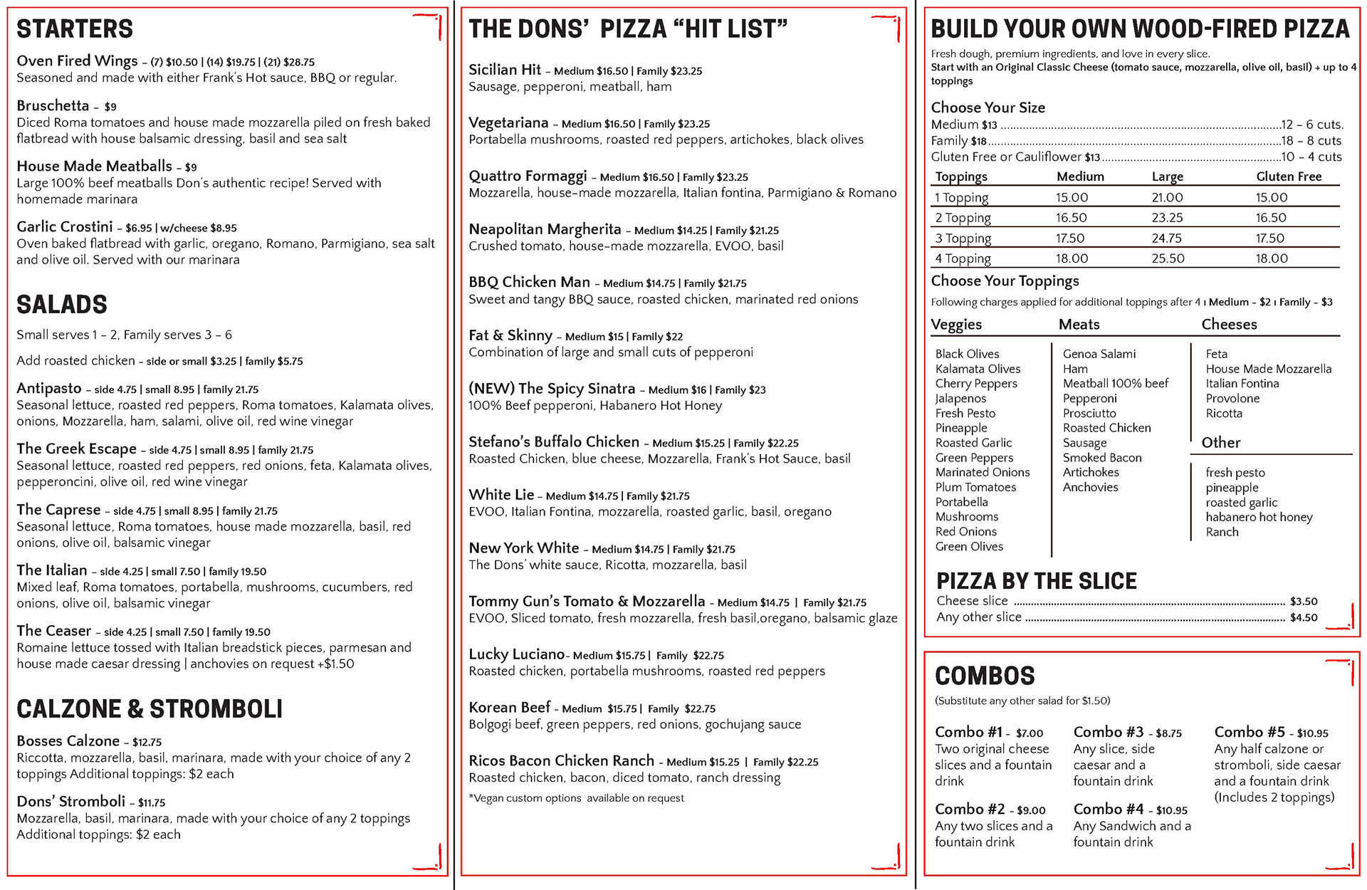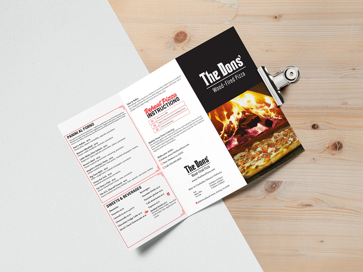 This is a trifold menu design I made from scratch during my internship with Imageworks Creative. For The Dons' Wood-Fired Pizza.