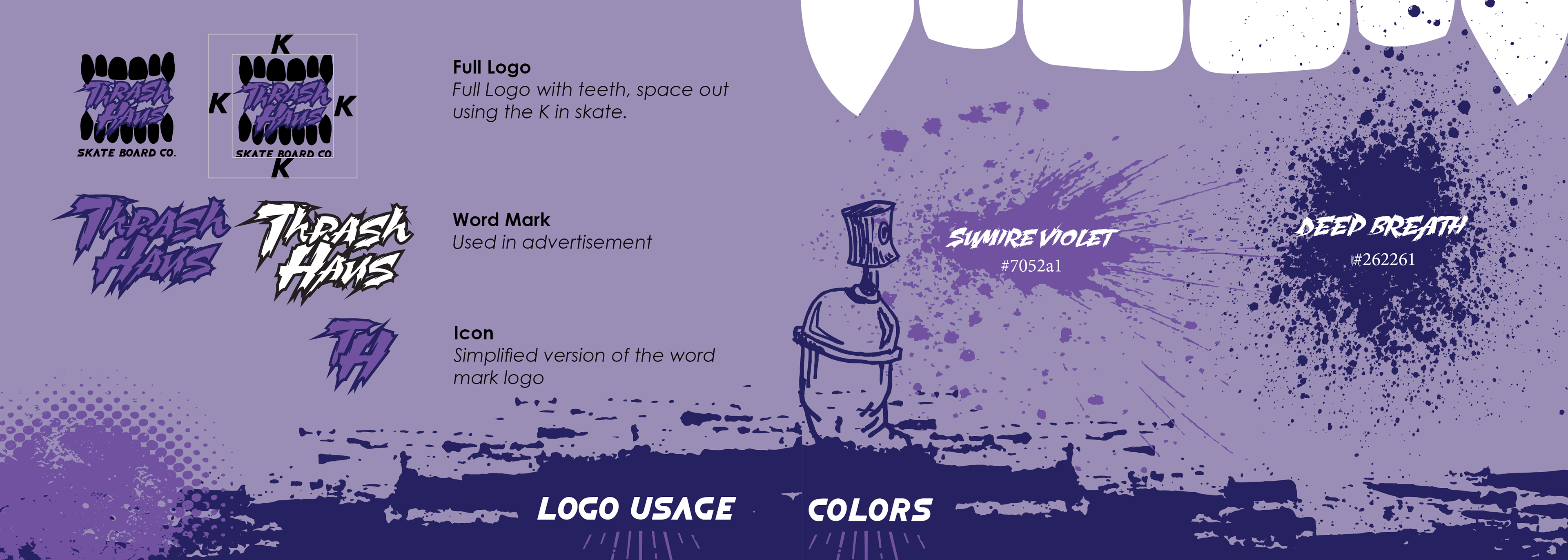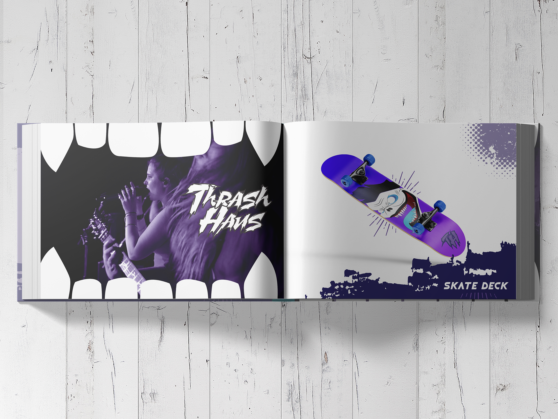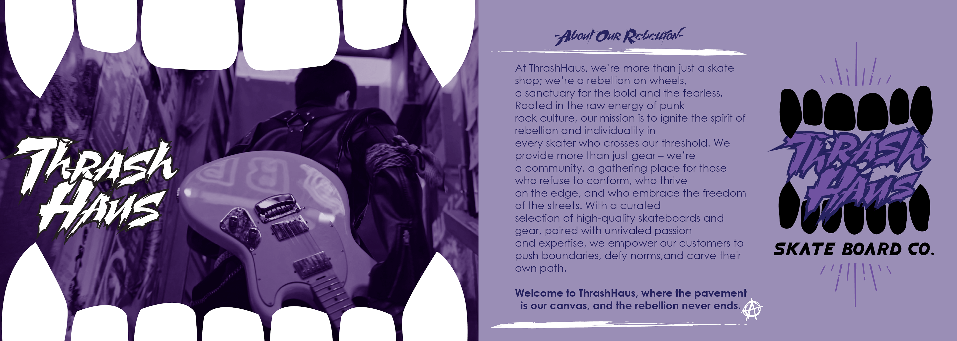 ThrashHaus was an extensive project created for a class at Tri-C, designed for teenagers and adults in the skate and punk rock scene. The brand includes merchandise, a brand guide, business cards, and supporting documentation.